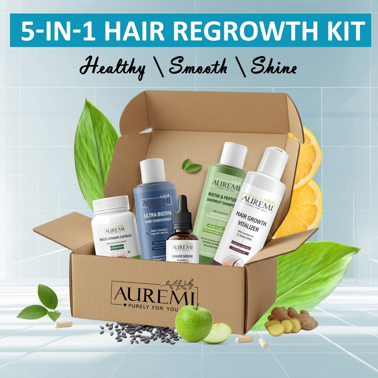 The Auremi 5-in-1 Hair Re-Growth Kit combines biotin shampoo, conditioner, ginger serum, herbal vitalizer, and multivitamin capsules for complete inside-out hair wellness support.