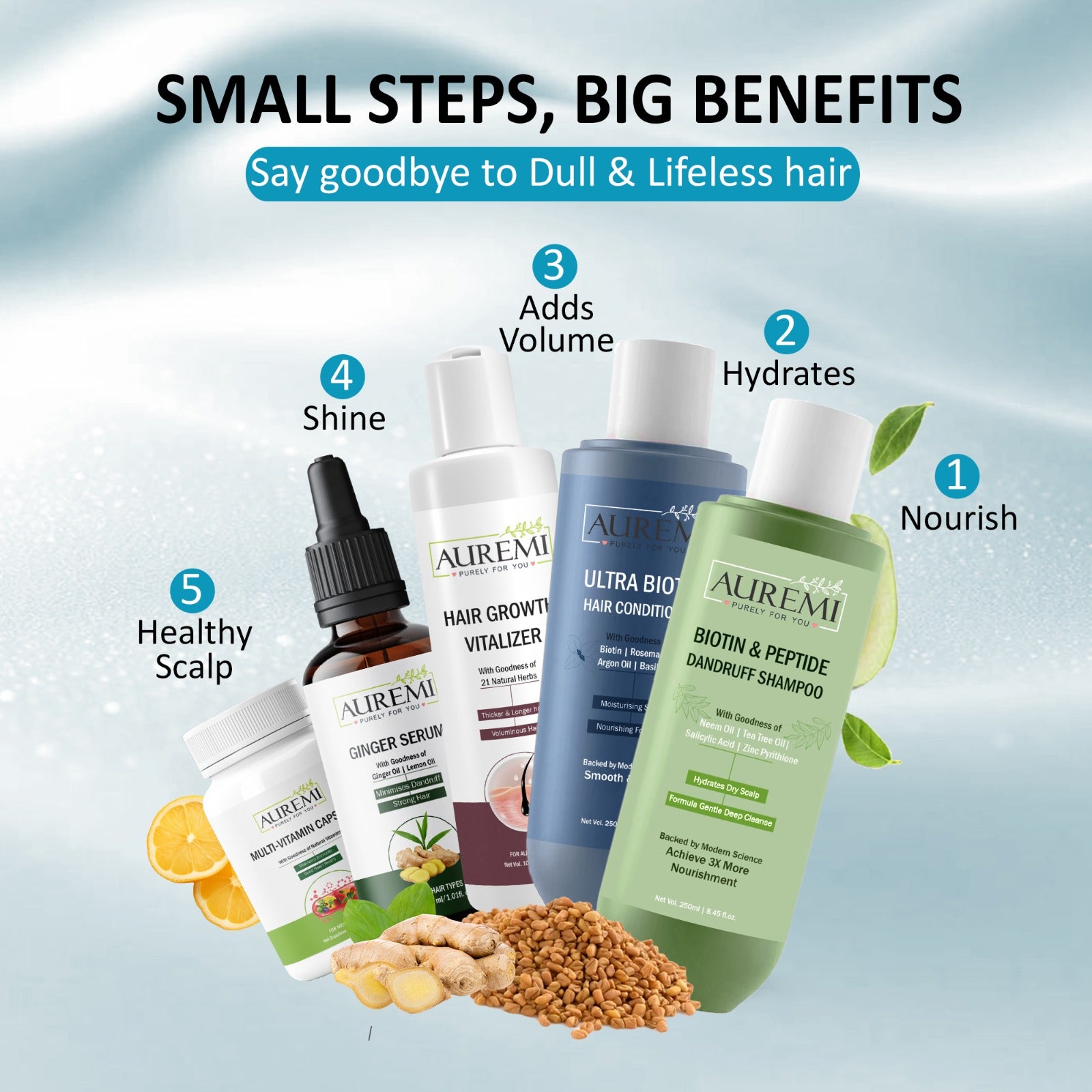 Auremi Complete 5-in-1 Hair Growth Treatment Kit | Shampoo + Conditioner + Ginger Serum + Hair Vitalizer Oil + Hair Multivitamin Capsules | Reduces Hair Fall, Strengthens Roots & Boosts Growth Naturally
